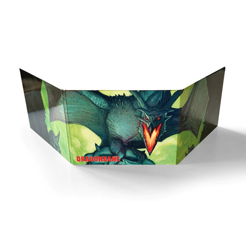 A deluxe Gamemaster Screen in landscape format for the Dragonbane RPG. It features Johan Egerkrans’s beautiful art on the outside and a host of useful tables and important information on the inside, while keeping the Gamemaster’s plans hidden from the eyes of inquisitive players.